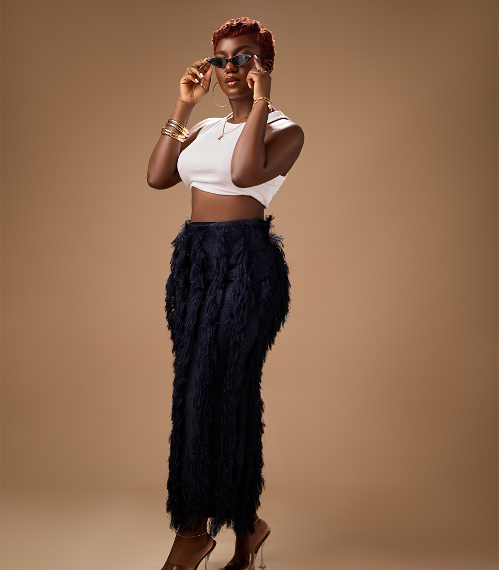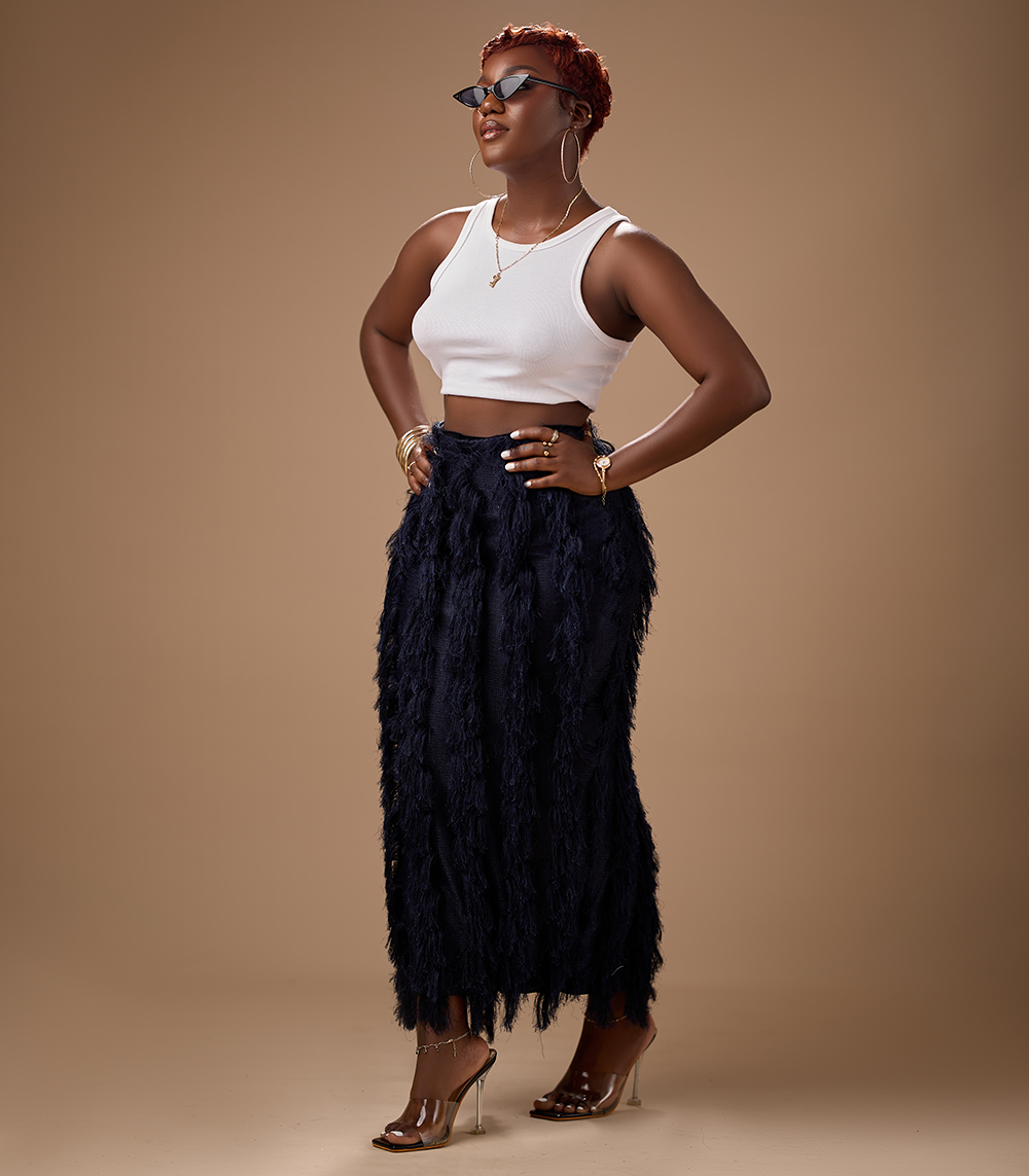 A rhythmic, fringed midi skirt designed for women who navigate life with mystery and power. Quietly royal. Silently bold. Best paired with minimalist tops and soft gold accents.