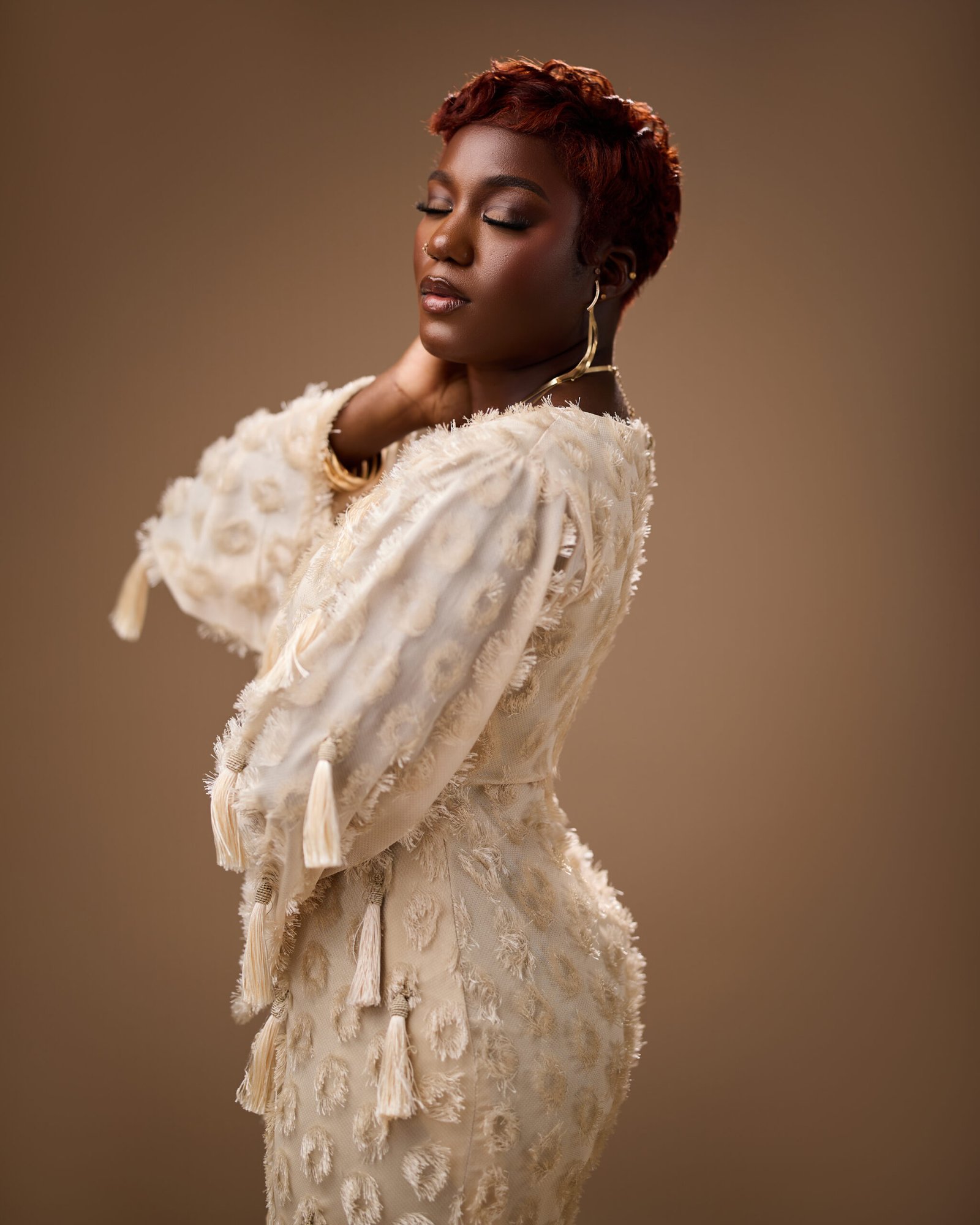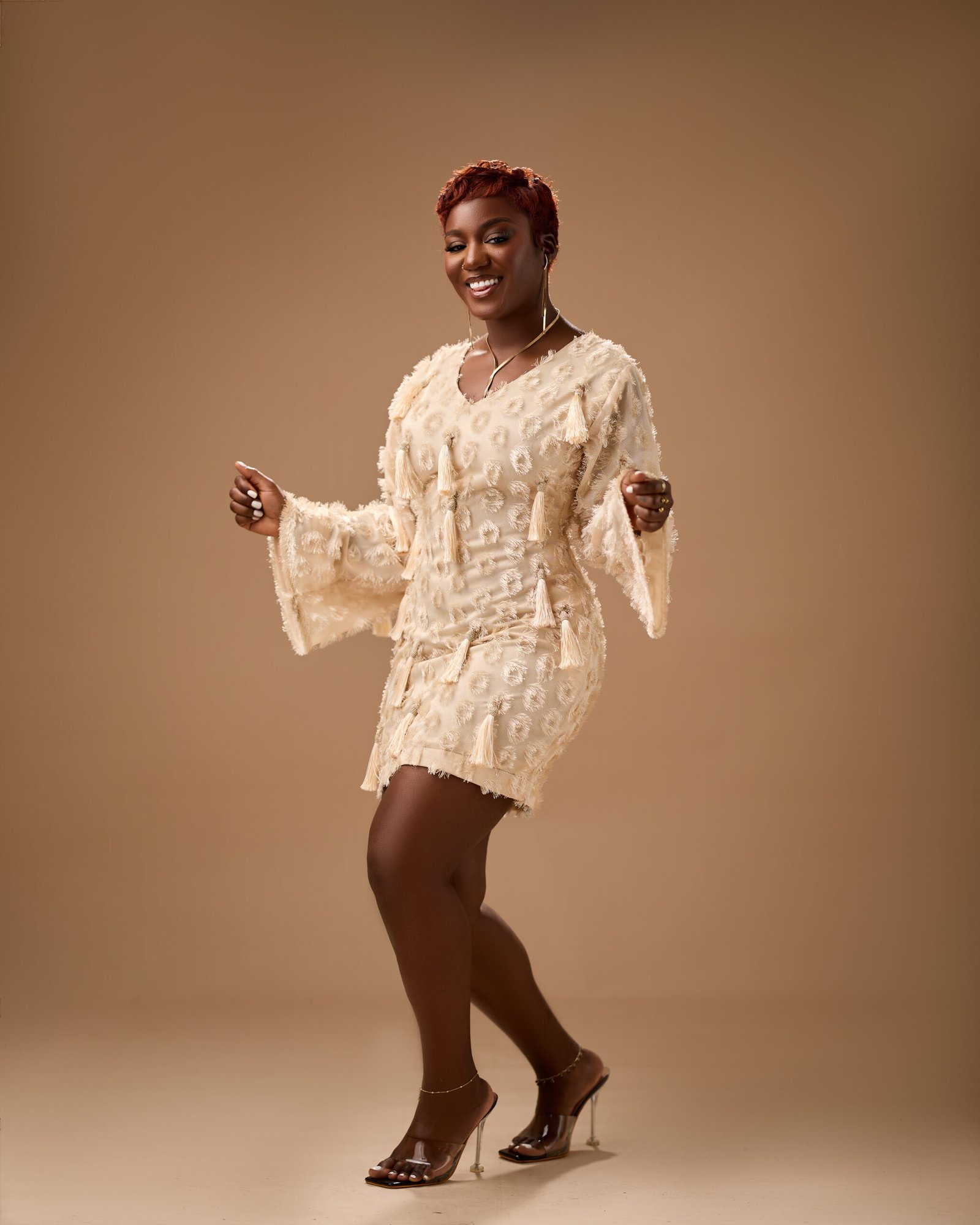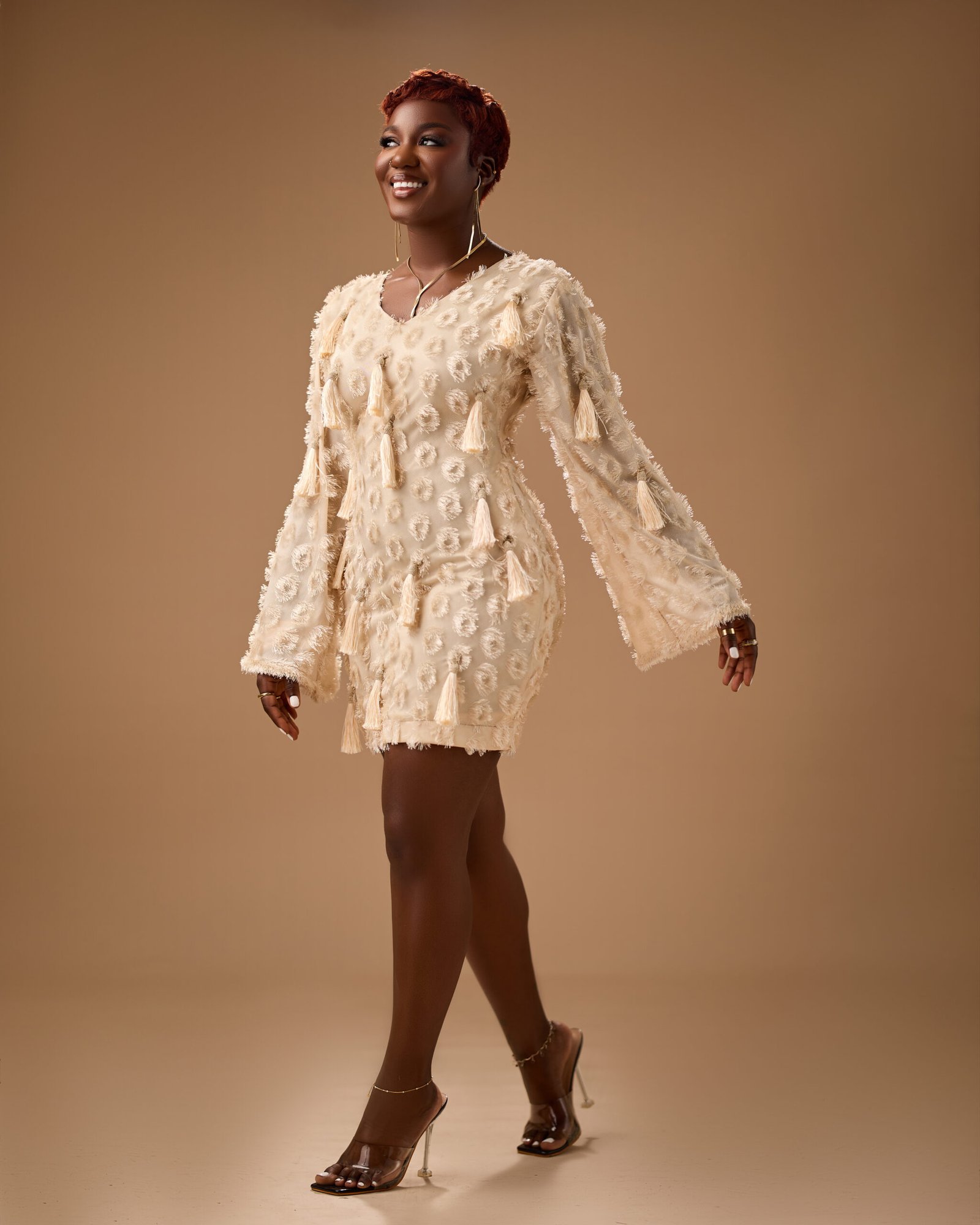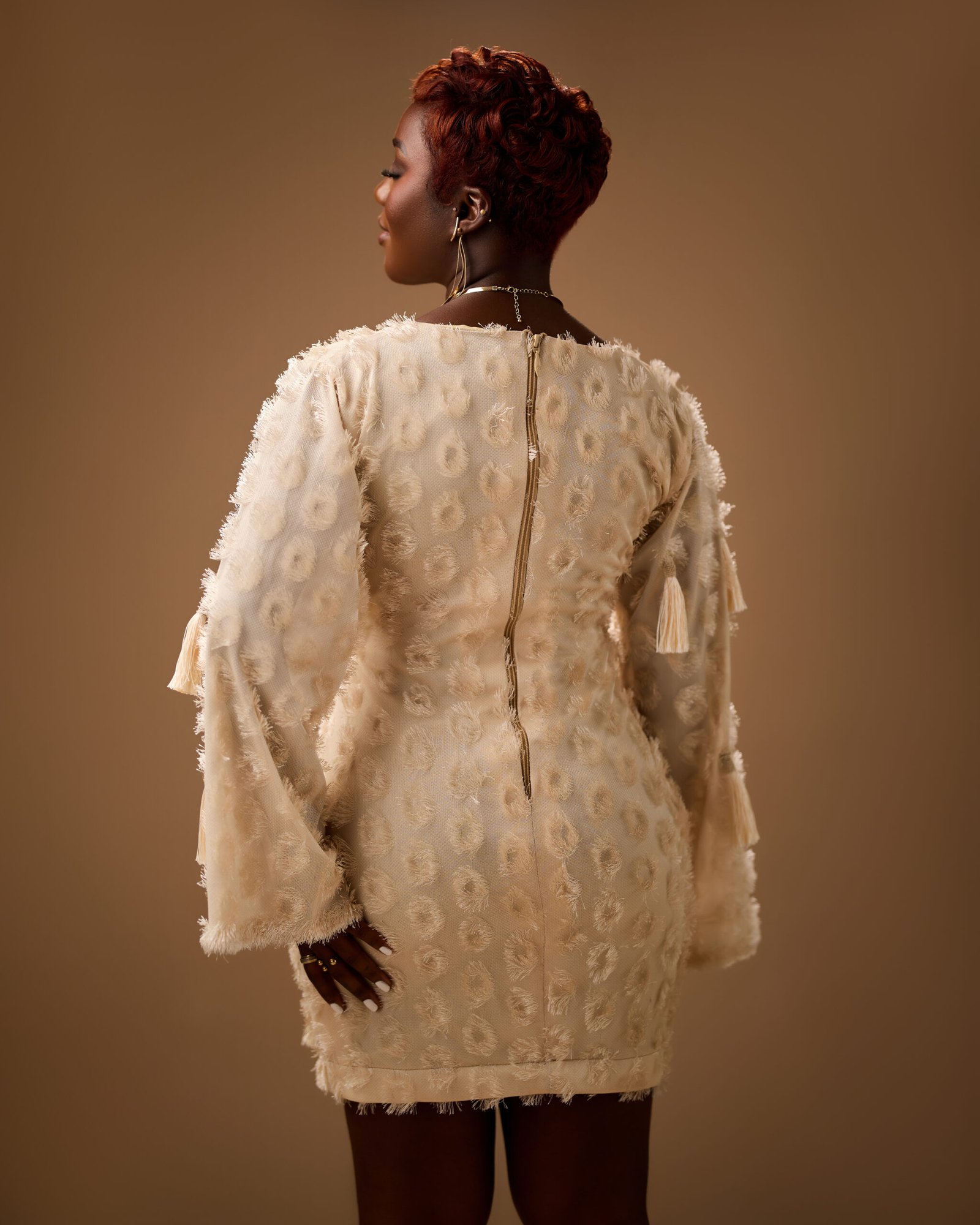 An ivory-gold mini dress adorned with tassel detailing that flows with celebration and sacredness.