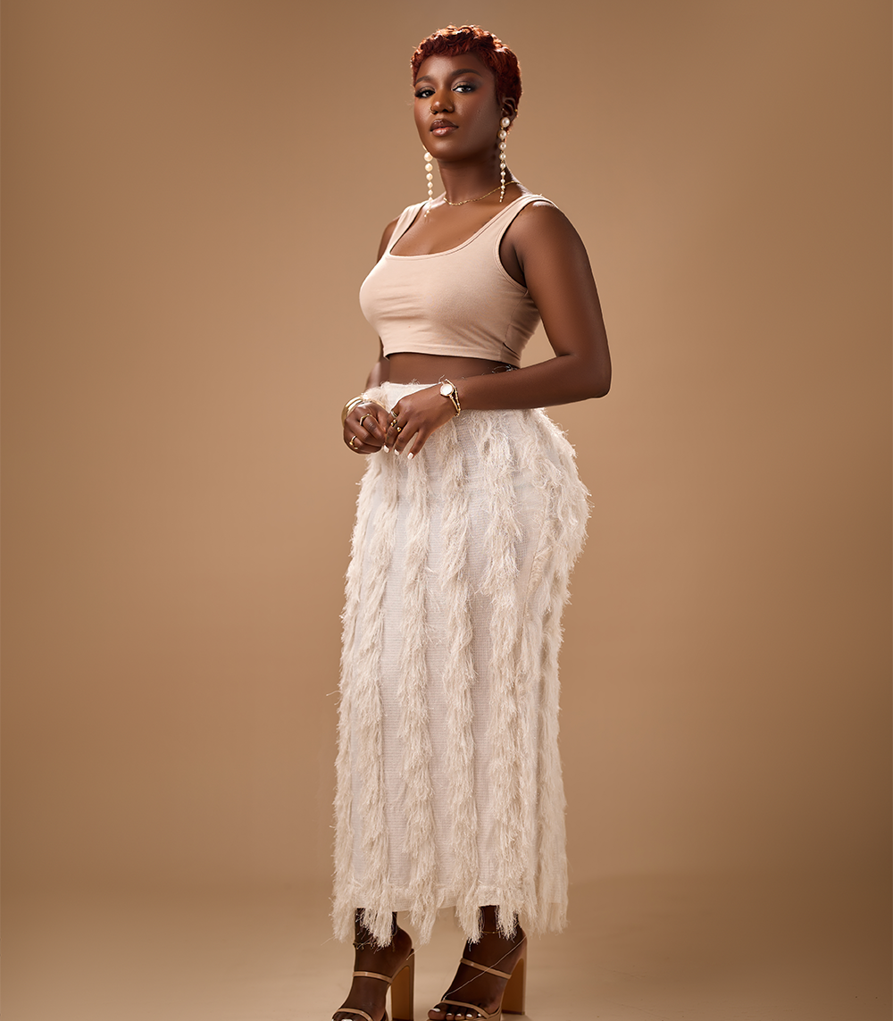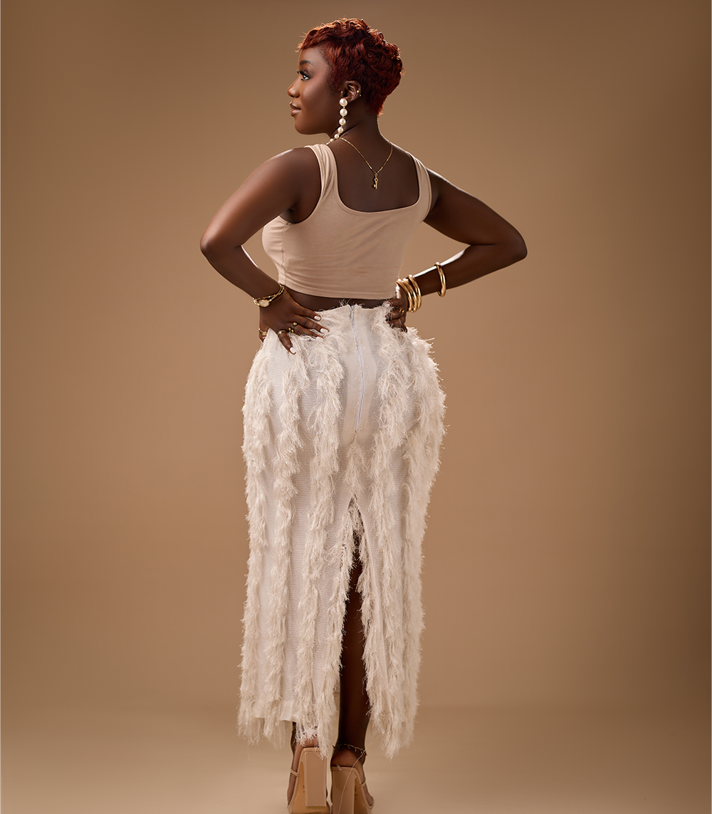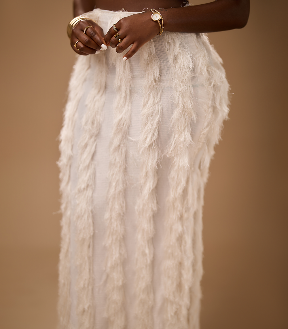 Textured in purity, this midi skirt feels like prophecy in motion. With soft vertical fringing and a silhouette rooted in sacred simplicity, it mirrors the Deep Waters Skirt in a consecrated ivory palette.